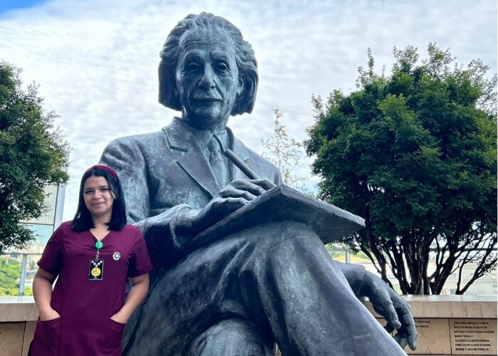 Ela concilia suas responsabilidades na presidência e no curso com a monitoria na Enfermagem do Einstein, atividade de apoio pedagógico que lhe permite vivenciar a rotina de trabalho e conviver com profissionais da área.